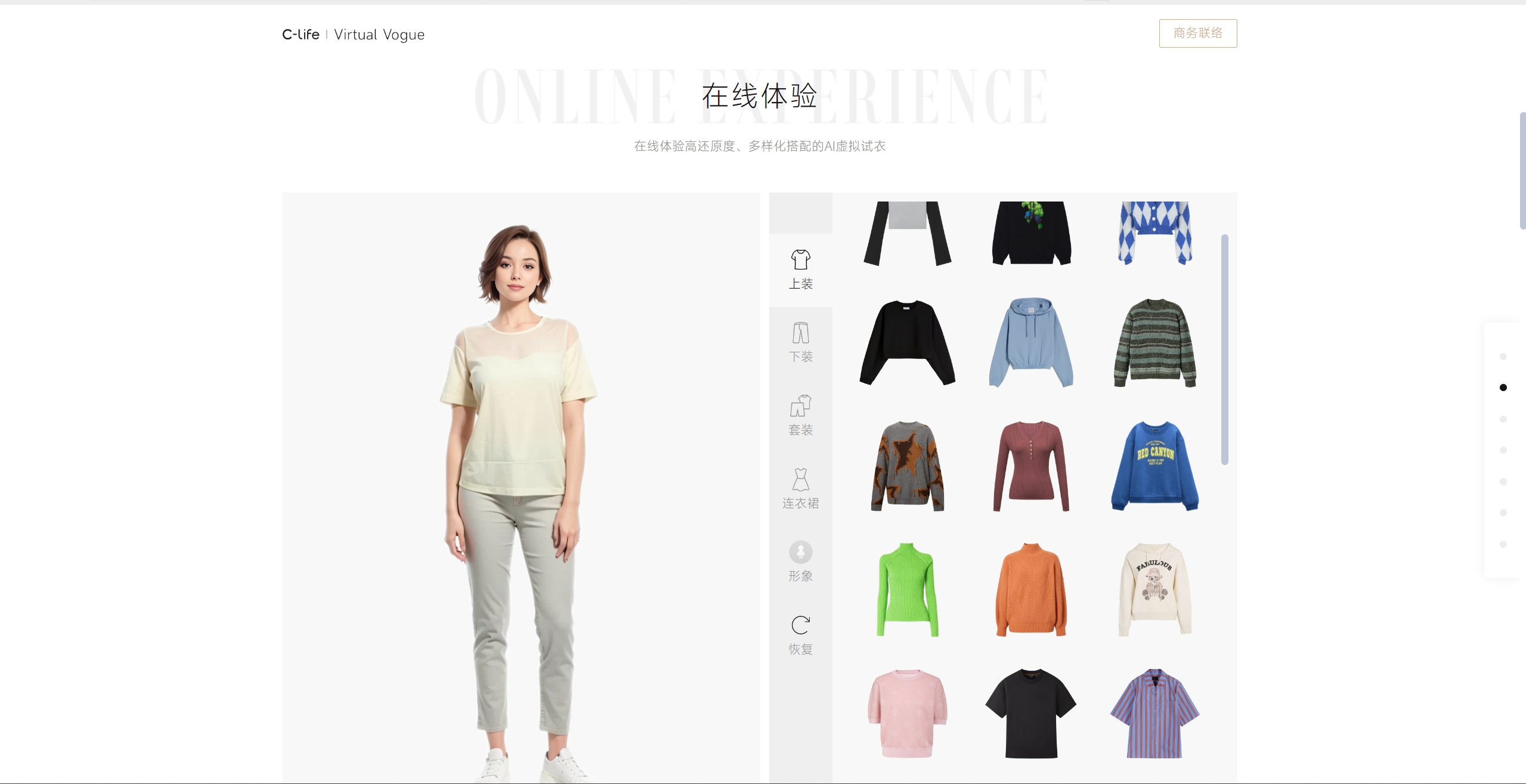 类别选择:用户可以选择试穿的服装类别(如上半身)。