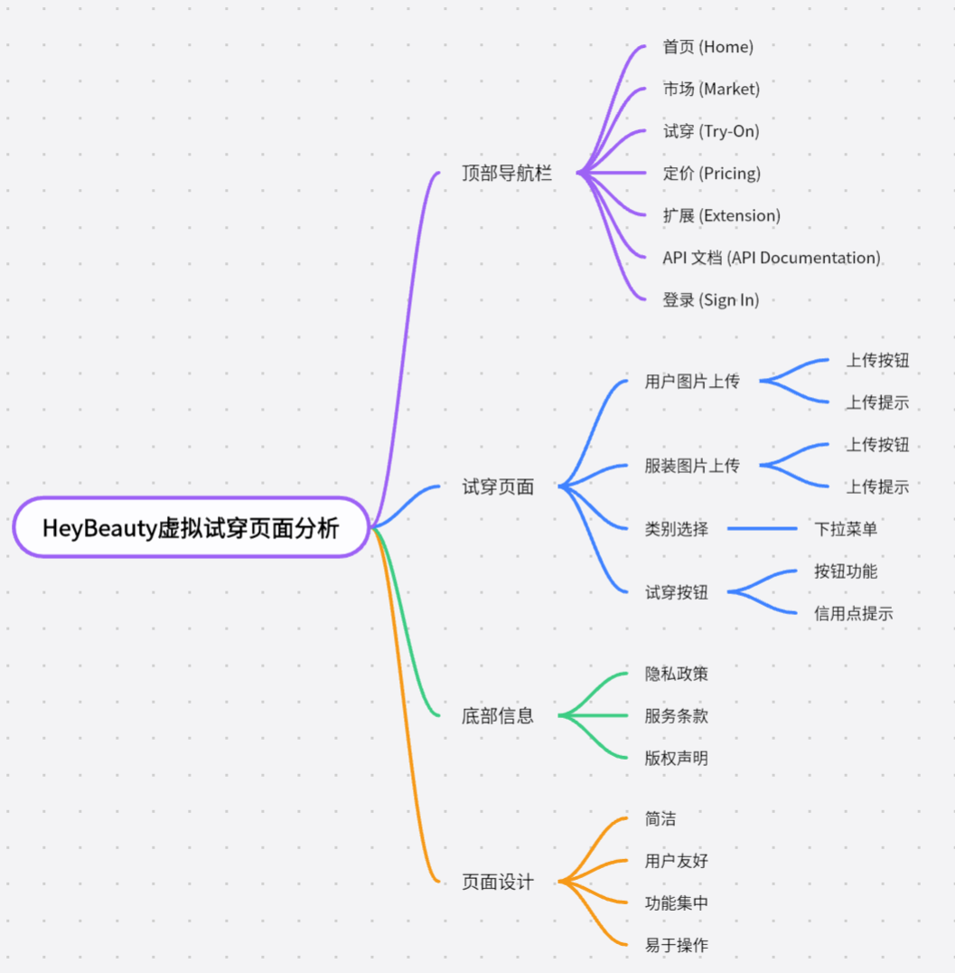 页面的产品结构描述了网站各个页面和模块之间的组织和层次结构。这对于理解用户如何在页面之间导航以及每个页面的主要功能是什么非常重要。以下是针对一个虚拟试妆网站 (https://heybeauty.ai/try-on) 的页面产品结构: