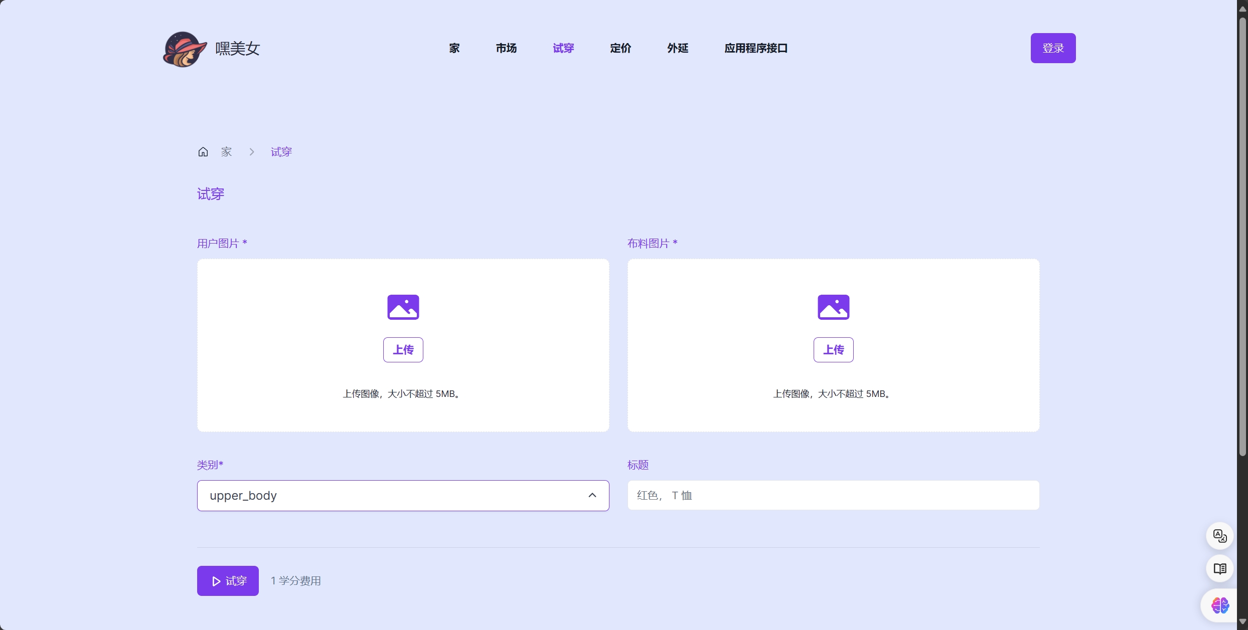 服装图片上传:用户可以上传服装图片进行试穿(大小限制5MB)。