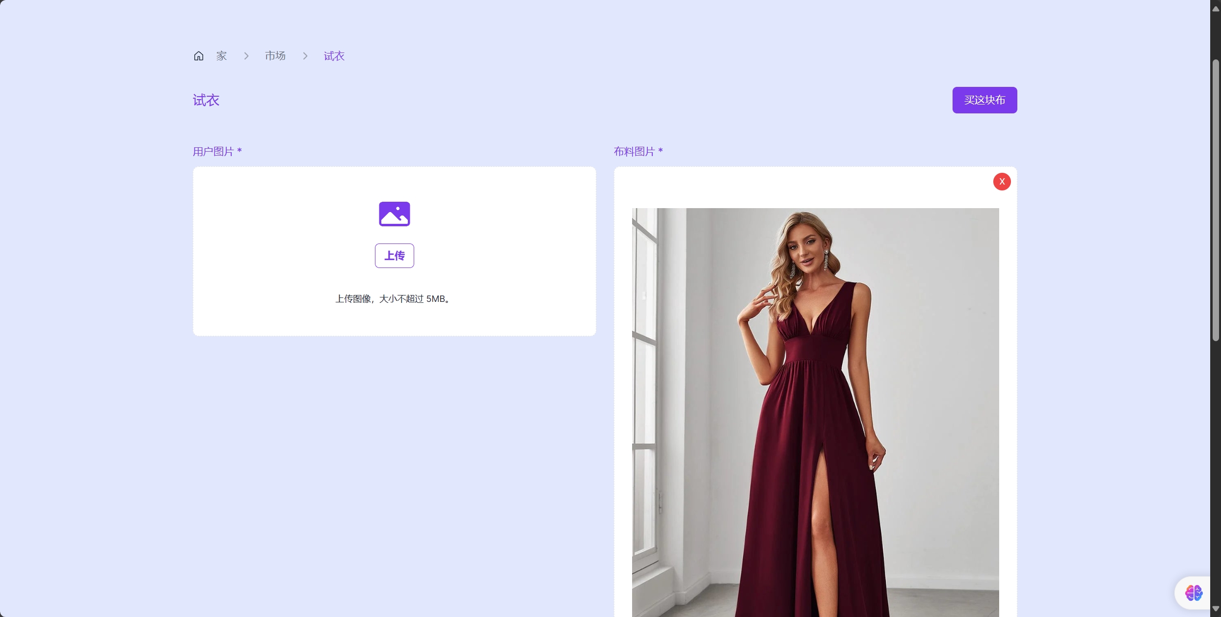 用户图片上传:用户可以上传自己的照片用于试穿(大小限制5MB)。