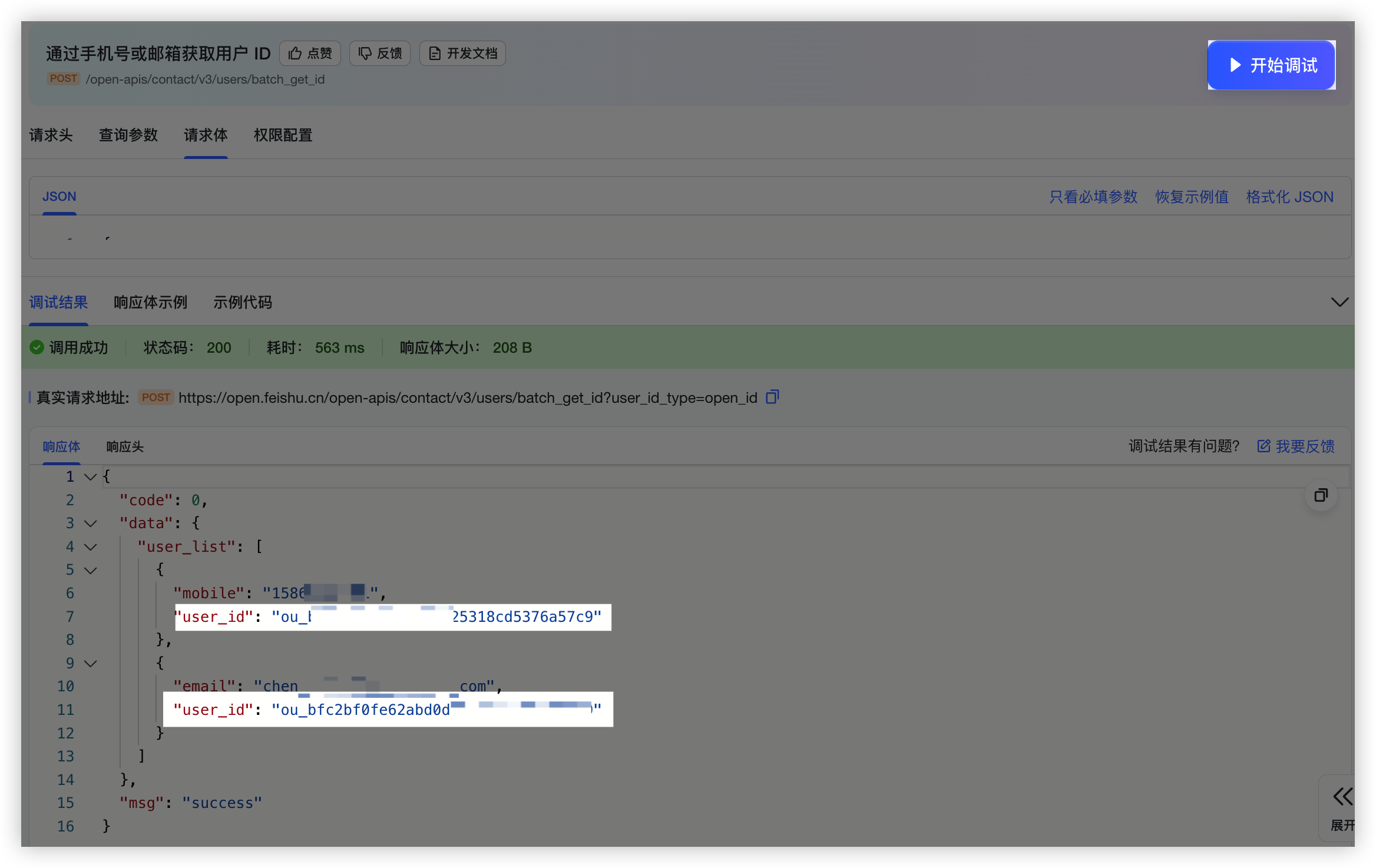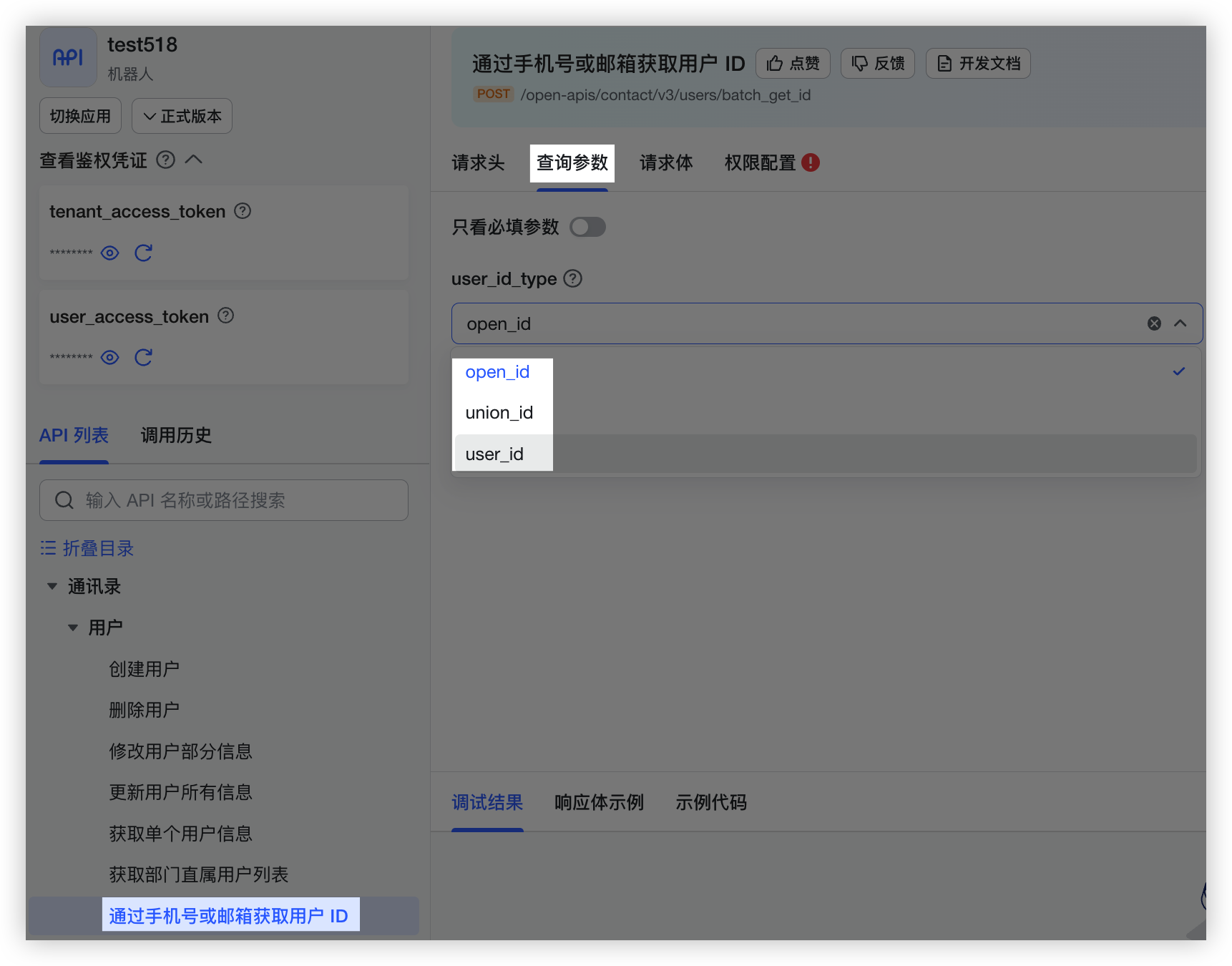 +receive_id_type | string | 是 | 消息接收者 ID 类型。支持 open_id/union_id/user_id/email/chat_id<br>**示例值**:open_id<br>**可选值有**:<br>- open_id:标识一个用户在某个应用中的身份。同一个用户在不同应用中的 Open ID 不同。[了解更多:如何获取 Open ID](https://open.feishu.cn/document/uAjLw4CM/ugTN1YjL4UTN24CO1UjN/trouble-shooting/how-to-obtain-openid)<br>- union_id:标识一个用户在某个应用开发商下的身份。同一用户在同一开发商下的应用中的 Union ID 是相同的,在不同开发商下的应用中的 Union ID 是不同的。通过 Union ID,应用开发商可以把同个用户在多个应用中的身份关联起来。[了解更多:如何获取 Union ID?](https://open.feishu.cn/document/uAjLw4CM/ugTN1YjL4UTN24CO1UjN/trouble-shooting/how-to-obtain-union-id)<br>- user_id:标识一个用户在某个租户内的身份。同一个用户在租户 A 和租户 B 内的 User ID 是不同的。在同一个租户内,一个用户的 User ID 在所有应用(包括商店应用)中都保持一致。User ID 主要用于在不同的应用间打通用户数据。[了解更多:如何获取 User ID?](https://open.feishu.cn/document/uAjLw4CM/ugTN1YjL4UTN24CO1UjN/trouble-shooting/how-to-obtain-user-id)。<br>- email:以用户的真实邮箱来标识用户。<br>- chat_id:以群 ID 来标识群聊。[了解更多:如何获取群 ID ](https://open.feishu.cn/document/uAjLw4CM/ukTMukTMukTM/reference/im-v1/chat-id-description)<br>**当值为 `user_id`,字段权限要求**:<br>获取用户 user ID(contact:user.employee_id:readonly)