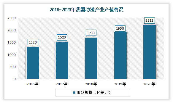 近年来随着国家对动漫产业的扶持、大量民间资本的投入(自2013年以来,得益于移动互联网的发展和普及,互联网巨头们纷纷进入动漫产业布局),以及新媒体和消费人群的多重驱动下,我国动漫产业出现了迅猛发展的良好势头,产值持续快速增长。有数据显示,2020年我国动漫产业产值从2016年的1320亿元增长到了2212亿元。