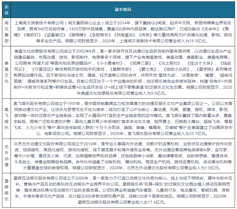 发展到目前,我国动漫产业已形成以广东、上海、北京为首,珠三角、长三角和环渤海地区协同发展的局势;资本市场已有许多具有优质 IP 资源、优质运营开发能力的动漫上市公司,如奥飞动漫、美盛文化等。预计随着我国互联网经济的快速发展、一系列产业政策的持续落地以及产业链的不断完善,动漫产业将逐步成为文化产业发展的重要引擎,互联网人口红利进一步释放将促使动漫产业加速增长,产业结构不断优化,创造出更多盈利空间。